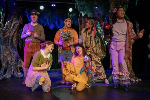 The ensemble is solid in portraying its wild array of characters, including the frog puppets, with performances that, at times, get close to overacting without it happening. Their actions have a commedia dell’arte sensibility in the sense of their silliness and anarchic qualities. There is an improvisational feel to some of the characterizations, most especially in the actions of the witch sisters.
