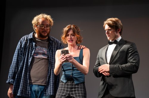 Tyler Tanner, Mychal Phillips and Marek Zurowski in a scene from David Rackoff’s new musical “Nothing Like Broadway!” at the Marjorie S. Deane Little Theatre (Photo credit: Arden Dickson)