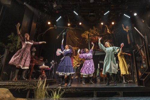 However, where the Peter Weir film used magical lighting and the atmosphere of the actual filming at Hanging Rock to recreate a mystical, supernatural feeling, the musical instead adds songs and dialogue. Unfortunately, Bell’s lyrics are either too prosaic or too poetic without creating a magical world, while Gold’s folk-pop score often sounds the same throughout. The busy set by Daniel Zimmerman which attempts to shoehorn the school and its stairway to the second floor, the hanging rock and its environs, and the five-piece orchestra all on the same stage seems rather cluttered along with the forest of trees and foliage in the background. The many-colored costumes by Ásta Bennie Hostetter for the girl students’ dresses vie with the background for our attention and there are often too many hues on stage simultaneously. While Barbara Samuels’ lighting is often exactly right, her plot using red for the picnic seems to make many of the girls look like they have picked up terrible sunburns in a very short time.