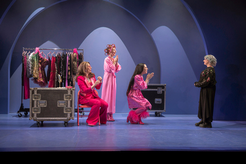 Sara Gettelfinger, Keri René Fuller, Natalie Walker and Milly Shapiro in a scene from The New Group production of the musical “The Last Bimbo of the Apocalypse” at Pershing Square Signature Center (Photo credit: Monique Carboni)