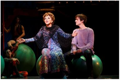 But isn’t everything in the telling? I so admired the woven into the show, crazy beautiful acrobatics and flying effects by Gypsy Snider of the Montreal-based circus company, Les 7 doigts de la main, yes, and I applauded Scott Pask’s restlessly captivating settings, and yes I was amused and/or captivated or both with the costumes of Dominique Lemieux, and yes, I thoroughly enjoyed the players, everyone, not just the principals, Terence Mann, Stephanie Pope (subbing for Leading Player Patina Miller), Matthew James Thomas, Charlotte d’Amboise, Rachel Bay Jones and that Andrea Martin but so many more because they went beyond antics. They reached us, again and again. The whole, dizzying, towering, funny, moving, exercise becomes a deep inside savoring for again and again.