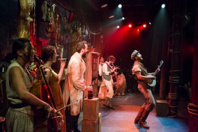The six members of the Lobbyists make up the cast along with Raymond Sicam III (on cello) who perform all of the characters as well as play all the instruments. The Melville Gallery has been decorated by set designer Jason Sherwood as a 19th century inn that seems to encircle the audience. Samantha Shoffner’s props (suggestive of both an inn and a schooner) include netting, ropes, glass jars, baskets, paintings and a ship’s wheel. After the band plays an introduction, Caldi (played by Tony Vo) offers to tell us the story of Gravesight, “the greatest harpooner who ever lived.”