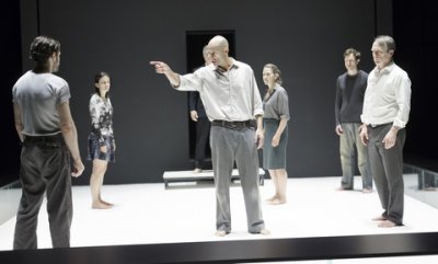 Among the production’s innovations, audience members sit on stage on either side of the square playing area which suggests a boxing ring, a cage or an arena. Designed by long-time van Hove associate Jan Versweyveld, the playing area is a white floor surrounded by a glass bench on three sides. The back wall is charcoal grey (like most of An D’Huys’ costumes worn through the evening) and contains a single doorway for entrances and exits. Versweyveld’s lighting rivets attention on this unadorned playing area. No props are used and actors appear before their scenes begin so that there isn’t a moment of wasted time. As the cast does not change costumes and the scenes segue into each other, there is the feeling that all the events take place on one day, fulfilling Aristotle’s unities of time, place and action.