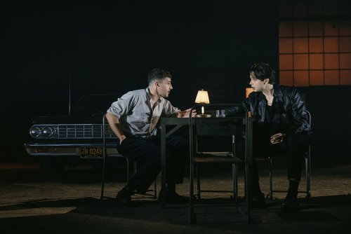 Like the car, anachronisms abound: a Starbucks coffee cup here, a 1940s wire recorder there, all mingling with costumes that similarly mix eras. Realistic furniture is largely replaced by metal tables, benches, and chairs. A phone conversation is spoken to the air, not to a prop.