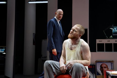 Mark Strong as Oedipus and Samuel Brewer as Teiresias in a scene from Robert Icke’s version of “Oedipus” after Sophocles at Studio 54 (Photo credit: Julieta Cervantes)