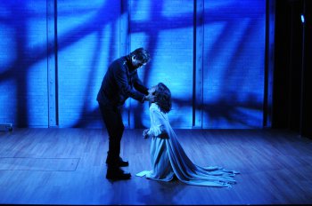 A battered leather jacket, aged jeans, a tuxedo, simple women’s garments, and a glamorous gown, are among the pieces of Whitney Locher’s costume design that cleverly represents the characters with flair and realism. Ms. Locher’s outfits for “Hamlet” and “Ophelia” have a delightful authenticity and easily could be used in an actual production of that play.
