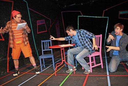The black walls and floor of the stage are decorated with neon colored strips arranged in geometric patterns, and the neon painted simple wood furniture, are the inspired work of set designer Brian Dudkiewicz. These simple adornments create a very abstract visual environment that complements the frenetic events. This is all very well accompanied by Jonathan Hartley’s lighting design.