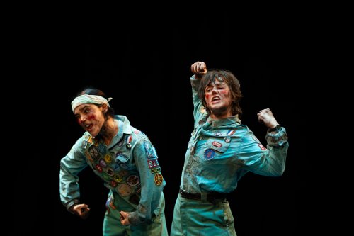 Each of the sections of the production is masterfully woven together with physical comedy, conversations with the audience, and short musical interludes. It is a process illuminating the psycho-social elements presumed in the male maturation process, such as showing toughness in the face of a challenge. It takes the viewer from the silliness of adolescent Boy Scout pranks to the seriousness of staying alive in a war.
