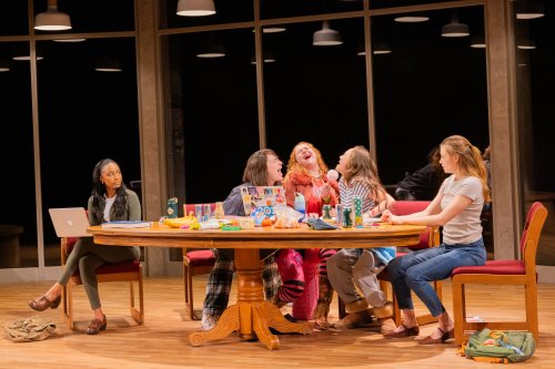 If you have been out of your college days awhile, particularly a sleep-away college, Natalie Margolin’s All Nighter will take you back to those days as they are lived now. The five women in the play, four of them housemates, are students at a small college in Pennsylvania, in May 2014, the last week before graduation. Sitting in Johnson Ballroom, the only 24 hour space on campus, they are having their last group all-nighter of their college career. Not only do they attempt to finish their last papers and cram for their last tests, but they sort out feelings and events that have taken up their last four years. They also solve a mystery but that is the story of the play.