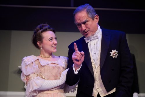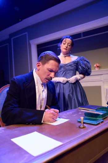 Jed Peterson and Evangelia Kingsley in a scene from The Storm Theatre’s production of Oscar Wilde’s “An Ideal Husband” at Jeffrey and Paula Gural Theater at A.R.T./New York Theatres (Photo credit: Michael Abrams)