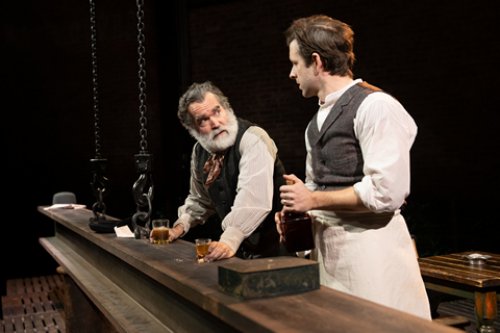 About twice the age of O’Neill’s heroine, that is not the problem with Williams’ interpretation of the title role. Her actressy performance using a great many awkward hand gestures undermines her Anna. Worse yet is the lack of chemistry between her and Tom Sturridge’s Mat when they should demonstrate love at first sight. Although he throws himself into a very physical performance, he does not connect with the other actors emotionally. Nor does it help that his Irish accent and Brian d’Arcy James’ Swedish accent as Chris (dialogue coaching by Deborah Hecht) are often impenetrable meaning a certain amount of the dialogue is lost. As Chris, James, his face hidden by a thick white beard, seems to let his accent do the heavy lifting as his performance as the sea captain and father seems rather superficial. On the other, in the brief scene in the first act bar, Mare Winningham as Marthy is very impressive as a weary woman of the wharves who knows the way of the world.