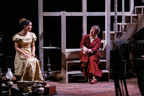 Shayvawn Webster and Caroline Campos in a scene from Bedlam’s production of Emily Breeze’s “Are the Bennet Girls Ok?” at the West End Theatre (Photo credit: Ari Espay)