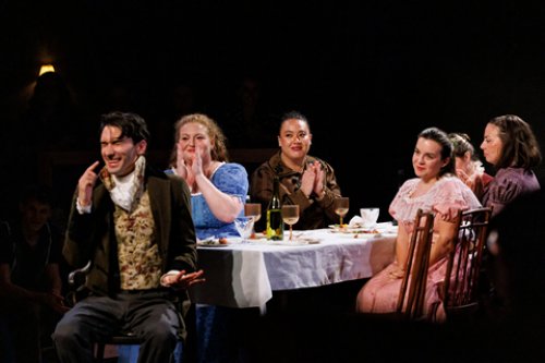 The style and tone of Are the Bennet Girls Ok? has been updated to contemporary language with the women using “like” and multiple curse words including the F-bomb so that although we see women dressed in Mariah Anzaldo Hale’s clothing from 1811 what we hear is 2025 language. And while the jokes suggest this is now a farce, none of it is very funny, with the men getting the worst of it. Both Charles Bingley (nicknamed “Bing Bong” by the Bennet sisters) and Fitzwilliam Darcy are figures of fun so that we do not see what the women see in them. While the original novel was a social comedy, the serious problem that the Bennet women must marry as they will be evicted from their house on the death of their father is no longer a consideration today: entailment to the oldest male heir was discontinued in England in 1925. Also unlike in 1811, women can now work and earn their own money.