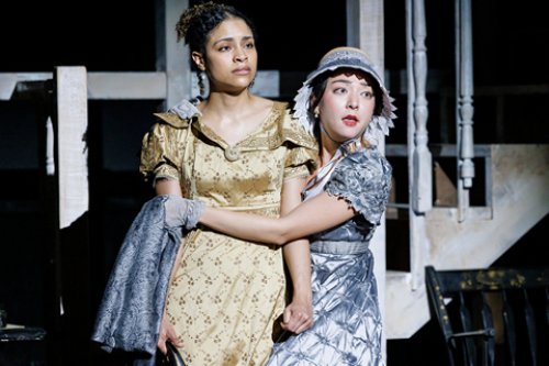 Shayvawn Webster and Zuzanna Szadkowski in a scene from the Bedlam production of Emily Breeze’s “Are the Bennet Girls Ok?” at the West End Theatre (Photo credit: Ari Espay)