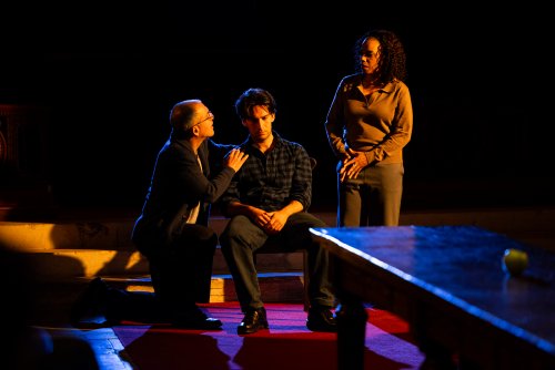 Juan Carlos Diaz, Sina Pooresmaeil and Debra Walton in a scene from the revival of Clifford Odets’ “Awake and Sing!” at the Sea Dog Theater (Photo credit: Jeremy Varner)