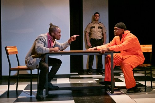 Roderick Lawrence, Abraham Makany and Shabazz Green in a scene from Idris Goodwin’s “Bars and Measures” at Urban Stages (Photo credit: Russ Rowland)