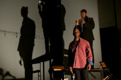 Roderick Lawrence and Shabazz Green in a scene from Idris Goodwin’s “Bars and Measures” at Urban Stages (Photo credit: Russ Rowland)