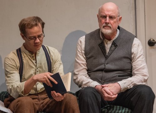 Samuel Adams as Moritz and Douglas Rees as Professor Weissmann in a scene from the Mint Theater Company’s production of the American premiere of Sally Carson’s “Crooked Cross” at Theatre Row (Photo credit: Todd Cerveris)