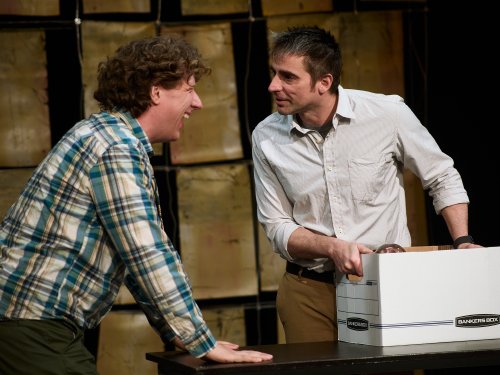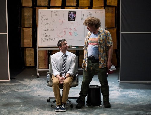 Andrew Block’s direction falls into a happily dizzying middle ground: quite loose for effective absurdism, yet lacking that Swiss watch precision needed to land as true agitprop, but that’s okay as we are adding to our own lists of what we would do with that ransom money. Ironically, it’s the sound design—often an afterthought in productions like this—that emerges as the most disciplined element. Tony Lepore underscores key moments with original percussion that is, if nothing else, immensely purposeful. Scott Fetterman’s overambitious set, which manages to be both fussy and functional, triples as an office, a garage, and later, a courtroom.