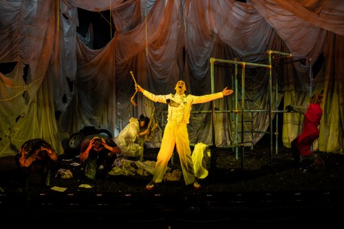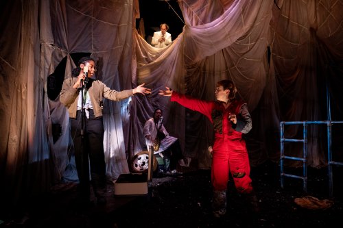 This four-character play starts in darkness, with a saxophone playing “Reveille,” accompanied by the sounds of explosions from bombs or cannons. The stage becomes bathed in red light as the saxophone flows into Country Joe and the Fish’s song “What Are We Fighting For,” and then transitions into a screeching sound as the first character, the Fool (Scout Backus), emerges from a large pipe at the side of the stage. They are unclear about how they came to this space after being killed in the war. They speaks of their search for pieces of their heart that were blasted away. The scene ends as the Fool exits bathed in a red light.