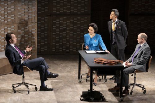 Max Gordon Moore, Kristen Hung, Fang Du and Daniel Jenkins in a scene from Anchuli Felicia King’s “Golden Shield” at Manhattan Theatre Club at New York City Center – Stage I (Photo credit: Julieta Cervantes)