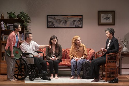Kristen Hung, Michael C. Liu, Ruibo Qian, Gillian Saker and Cindy Cheung in a scene from Anchuli Felicia King’s “Golden Shield” at Manhattan Theatre Club at New York City Center – Stage I (Photo credit: Julieta Cervantes)