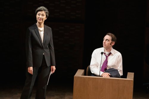 Cindy Cheung and Max Gordon Moore in a scene from Anchuli Felicia King’s “Golden Shield” at Manhattan Theatre Club at New York City Center – Stage I (Photo credit: Julieta Cervantes)
