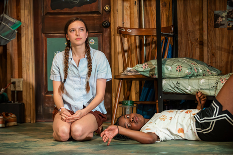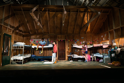 Honestly, sans the play’s title and Louisa Thompson’s evocative cabin set, complete with bunk beds and other just-right details, one could easily think that some force–malevolent or its haughty opposite–had consigned the characters, and us, to purgatorial torment. That inkling is reinforced by the last adult at the camp: an unnamed, taciturn guitarist (Alden Harris-McCoy) with a fondness for spiritual mood music that might be intended to elicit purifying agony. He also, either because of improvisational genius or an unseen rehearsal, keeps Blue’s musical from being a solo endeavor, though, bizarrely, he doesn’t necessarily feel a part of it, either.