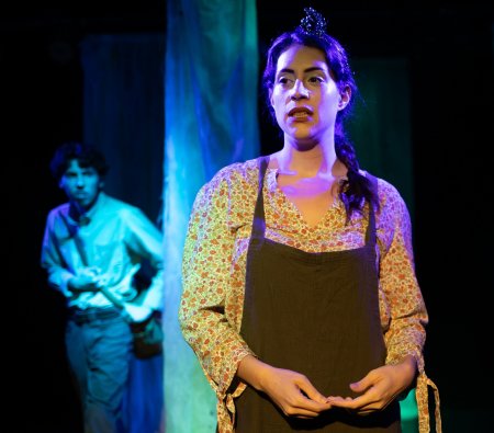 The background on the story indicates that The Adventures of Huckleberry Finn by Mark Twain was an inspiration for the story, but the only connections to that book seem to be the idea of traveling on a river and speaking a dialect of English typically associated with poorly educated people. Two examples of the form are in the first two scenes. Hucka (Brooke Elizabeth) in the opening monologue says, “I don haf ta pay hardly pay no attention to ‘em.” And in the next scene, Cain (Carson Merrick) says, “Ya tol me ya war gointa finish this ‘fore sunup.”