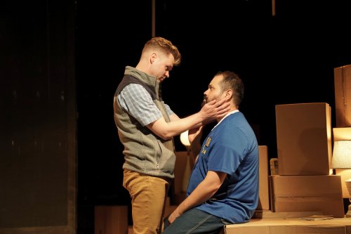 John Evans Reese as Horatio and Francisco Arcila as Hamlet in a scene from Manuel Ortiz’s “Manifest Destiny” at Teatro LATEA at The Clemente Soto Vélez Cultural Center (Photo credit: Viktorija Mickute)