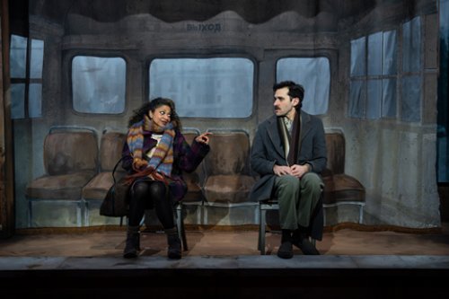 Rebecca Naomi Jones and Adam Chanler-Berat in a scene from Lauren Yee’s “Mother Russia” at the Pershing Square Signature Theatre Centre (Photo credit: HanJie Chow)
