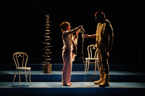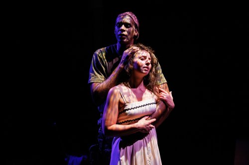 Perri Yaniv as Michael Cassio and Sophia Marilyn Nelson as Desdemona in a scene from Keith Hamilton Cobb’s “Nine Moons” at the Theater for the New City (Photo credit: Maria Baranova)