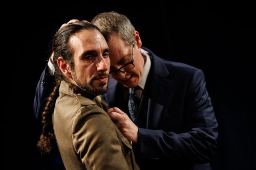 Perri Yaniv as Michael Cassio and Aaron Michael Zook as Brabantio in a scene from Keith Hamilton Cobb’s “Nine Moons” at the Theater for the New City (Photo credit: Maria Baranova)