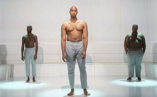 When the audience enters the theater, they see on stage three black men (listed in the program as Person on the Left, Person in the Middle, and Person on the Right) dressed in pants, barefoot and shirtless, on an all-white stage that suggests a medical waiting room. High up on the wall are three screens on which numbers continually rise. (We later realize that these are the statistics about the number of men who have contracted AIDS.)