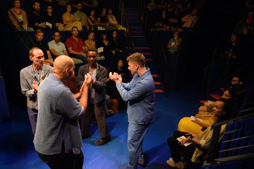 When it finally arrived—two long years later—it came not diminished but distilled. The time away seemed to have only intensified the piece, honing it to a glittering point of emotional precision. And how audaciously it returned! In a city still flinching from the nearness of breath, Oratorio embraced intimacy as a kind of radical act. Audiences were not merely close to the performers; they were enveloped, encircled, drawn into the ritual itself. Seated on tight risers arranged in an oval onstage, spectators became part of the sacred geometry, as the twelve blue-clad vocalists surged around them—above, beside, behind—enfolding the human chorus in another, holier one.
