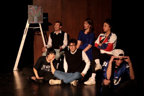 Chris Carver, Camber Carpenter and Frances Karagio (top row); Kathryn Taylor, Ben Elias and Joseph Monseur in a scene from Richard Krevolin’s “Our Town…but Wilder” at the Actors Temple Theatre (Photo credit: Adam Smith)