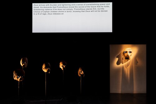 Prometheus Firebringer is an example of what Dorsen refers to as “algorithmic theater” where she asks an audience to focus on language and what power we hand over to Artificial Intelligence when we, the humans, don’t do the work ourselves. Between segments of reading the “play,” actually referred to by Theatre for a New Audience as an “Event: Hybrid Performance/Lecture,” Dorsen turns the duties over to the AI behind the hollowed-out eyes we see onstage in the form of a precursor to ChatGPT, GPT-3, to generate/perform what Aeschylus may or may not have written 2,500 years ago. The kicker here is that AI isn’t accountable to any director or stage manager, or playwright for that matter – you get different text at every performance, and all in a mere 45 minutes! We should have surmised as much from the pre-show. There is a screen hanging above the five orphan masks that displays a continuous typing and wiping itself out of a selection of AI-proposed synopses of the play that all start “The play begins with…”