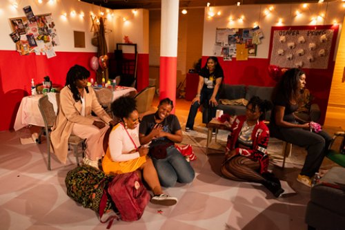 Nedra Snipes, Breezy Leigh, Brittany Davis, Claudia Logan, Clarissa Vickerie and Mikayla Lashae Bartholomew in a scene from Nia Akilah Robinson’s “Push Party” at the Theaterlab (Photo credit: Travis Emery Hackett)