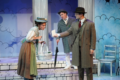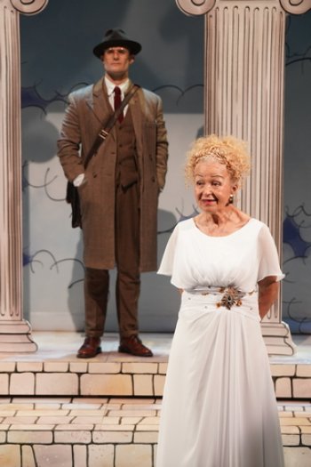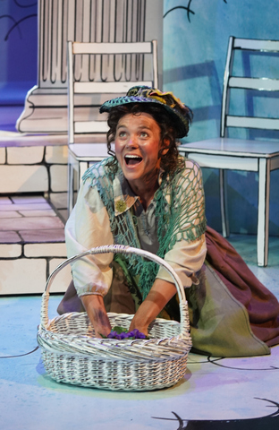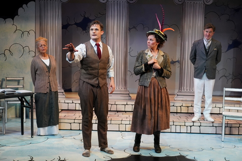 In their latest, Shaw’s ever-popular Pygmalion, Staller has staged Shaw’s never-used prologue created for the 1938 film version which has the gods and goddesses on Mt. Olympus recount to the modern audience the myth of Pygmalion and Galatea which inspired Shaw’s Edwardian comedy. The set by Lindsay G. Fuori creates an Al Hirschfeld-inspired Greek temple used for all of the play’s five scenes. Four of the actors dressed in white Grecian robes (courtesy of designer Tracy Christensen) greet us and tell us the myth that we will see in Shaw’s updated 20th century comedy in which the sculptor becomes a professor of language and linguistics and the statue becomes a flower girl who wants to improve her speech well enough to get a job in a flower shop. However, Staller does not stop there but has created narrative introductions for each act which is rather intrusive though it may help some first-time viewers to understand the play. (Is there any theatergoer who has not seen the play’s musical version My Fair Lady on stage or screen?)