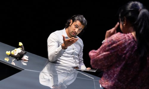 Keshav Moodliar as Arvid and Avanthika Srinivasan as Sanan in a scene from Madhuri Shekar’s “Queen” at A.R.T./New York Mezzanine Theatre (Photo credit: Jeremy Daniel)