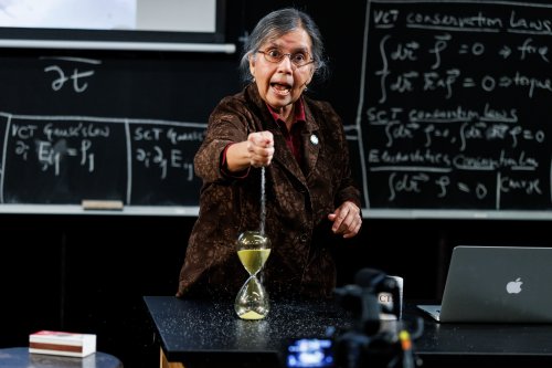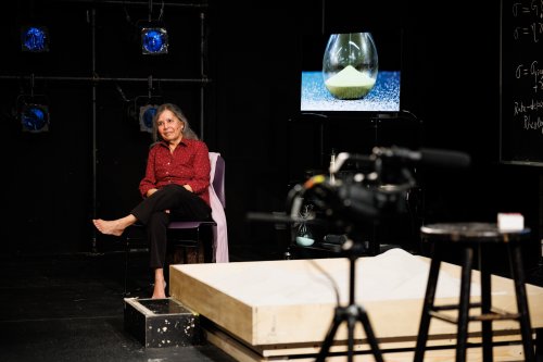When the audience enters the Peter Jay Sharp Theater at Playwrights Horizons, Bulbul is at a huge blackboard writing equations. In front of her are a lab table with a large hour glass, a laptop, a tv monitor, a sandbox, a tv camera and a chair. When she begins addressing the audience she explains that her field is theoretical physics and that she is interested in the properties of sand, how it can sometimes work as a solid and sometimes work as a liquid. Using the hour glass as an example, she asks us if the sand inside is acting as a solid or a liquid? This study of materials deforming from one state to another is the science of Rheology.