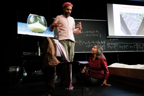 Rheology previously seen at Brooklyn’s Bushwick Starr in the spring of 2025 has reopened at Playwrights Horizons and proves to be a unique meta-theatrical experience with both performers, a real mother and son, theoretical physicists Bulbul Chakraborty and writer/director Shayok Misha Chowdhury (Pulitzer Prize finalist for Public Obscenities), appearing as themselves. Written and directed by Chowdhury in association with Chakraborty, Rheology begins as a physics TED talk on sand as “capricious matter” (Bulbul’s field) then switches to a demonstration of stage directing (Misha’s field), and finally becomes a metaphysical discussion on life and death tying the two together. This is an unusual theatrical presentation, one you will ponder for a long time to come.