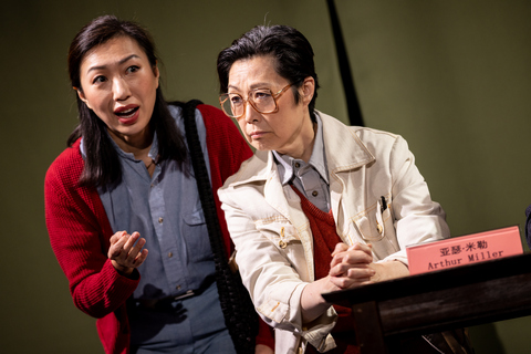 Sonnie Brown as Arthur Miller and Julia Gu as Biff Loman in a scene from Jeremy Tiang’s “Salesman 之死” at the Connelly Theatre (Photo credit: Maria Baranova)