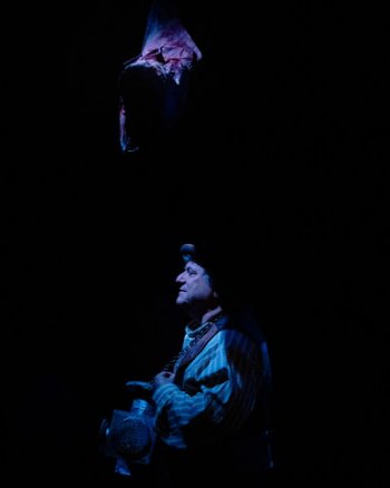 Visually and viscerally, Glezer’s staging commits fully to Wallace’s aesthetic of the grotesque sublime. The action largely unfolds on and around a long central table, a symbolic altar for both the butchery of animals and the sacrifice of human bodies under capitalism. The design, to its credit, is striking: a runway stage displaying hanging carcasses swaying gently like pendulums of doom, and a wall with a throne-like chair that represents the management office if greed and authority emanate from some subterranean hellmouth. It is a production rich in sensory invention. Glezer and team (scenic designer Forest Entsminger, lighting designer Celia Krefter, costume designer Hannah Bird, props designer Jonathan Schatzberg, and sound designer Emma Hasselbach) deploy colors and sound with stormy abandon, and live music weaves through the production like a ghostly radio signal from somewhere deep inside the building’s pipes.