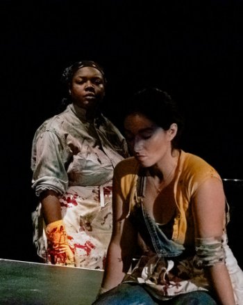 Le’Asha Julius and Lucy Buchanan in a scene from Naomi Wallace’s “Slaughter City” at The Jeffrey & Paula Gural Theatre at A.R.T./New York Theatres (Photo credit: Matt Cubillos)