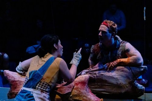Here, meatpacking workers in bloodied aprons flirt, bicker, sing, and slice—while somewhere just outside the periphery of the naturalistic lurk phantoms, time warps, and a meat-grinding specter from another century. The ostensible setting is Slaughter City, U.S.A., a nowhere-everywhere meatpacking plant suspended in a sort of Brechtian limbo, where the past bleeds into the present and the workers speak in epigrams and extended metaphors. These aren’t conversations so much as incantations, and what is left unsaid — about unionization, exploitation, or actual political stakes — looms larger than what is spoken.
