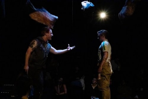 Ban Natan and KP Sgarro in a scene from Naomi Wallace’s “Slaughter City” at The Jeffrey & Paula Gural Theatre at A.R.T./New York Theatres (Photo credit: Matt Cubillos)