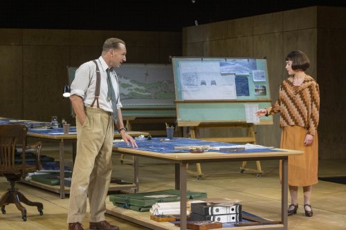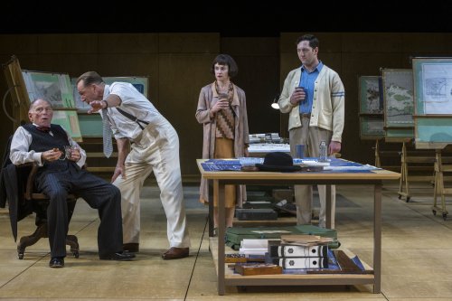 Using a thrust stage for the first time in The Shed’s Griffin Theater with the audience sitting on three sides, Bob Crowley’s sets come and go, beautifully creating offices, meeting spaces and a palatial home with the minimum of time and effort while at the same time filling up the large stage with realistic designs. His costumes perfectly depict the 1920’s and the 1950’s. The sound design by George Dennis and the original music by George Fenton are redolent of the two eras. Mextly Couzin’s subtle lighting for The Shed production never draws attention to itself but focuses attention on just the right location in each scene.
