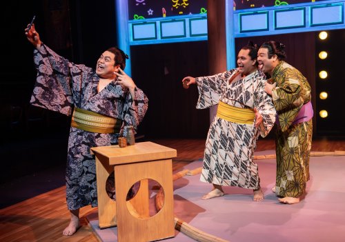 Despite its predictable overarching plot, Sumo, produced jointly by the Ma-Yi Theater Company and La Jolla Playhouse, is never boring. Partly, that’s because, as Mitsuo, Shih is villainously charismatic, portraying the preening bully with the disarming and false sense that there is a method to his sadism. But, even more compellingly, Sumo is an immersive and sumptuous eyeful–no matter your personal predilections for loincloths and bare, overhanging bellies–with a set, props, costumes, projections, and all that glorious sumo hair provided by Wilson Chin, Thomas Jenkeleit, Mariko Ohigashi, Hana S. Kim, and Alberto “Albee” Alvarado respectively. As for the main event, there is certainly loads of cheer-inducing sumo wrestling throughout the play, but it’s the sumo karaoke after the intermission that adds much-needed joy to the proceedings. That exhilarating scene, aided by Paul Whitaker’s vibrant lighting effects mixed with Fabian Obispo’s equally energetic sound design, also offers director Ralph B. Peña the opportunity to let the actors cut loose, at least for a little while.