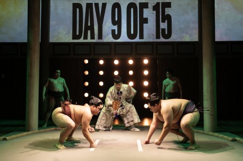 Playwright Lisa Sanaye Dring valiantly navigates these complex historical currents in Sumo, struggling mightily to stay afloat in the first act before finally relaxing the oars a bit in the second. Dring’s largely self-inflicted difficulties come from a desire to educate, which is not synonymous with enlightening and frequently diametrically opposed to entertaining. Dring pursues the latter two objectives only after trying to help the audience tell its ōzeki (a notch below the sumo hierarchy’s pinnacle) from its rikishi (the generic word for sumo wrestlers), as well as learn oodles more sumo terminology it’s hard to keep straight when entering the theater with sumo knowledge that doesn’t extend beyond the loincloths (mawashi). While that’s a likely burden for a substantial chunk of the audience, it’s a bigger one for Dring whose dialogue gets bogged down in annotative concerns.